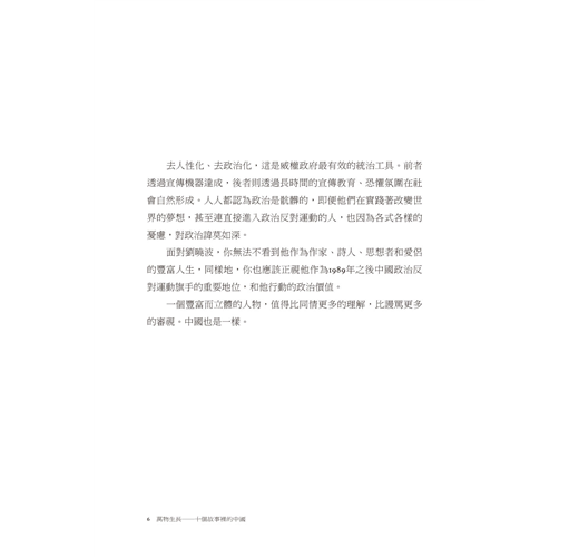 面對劉曉波,你無法不看到他作為作家、詩人、思想者和愛侶的豐富人生,同樣地,你也應該正視他作為1989年之後中國政治反對運動旗手的重要地位,和他行動的政治價值。
