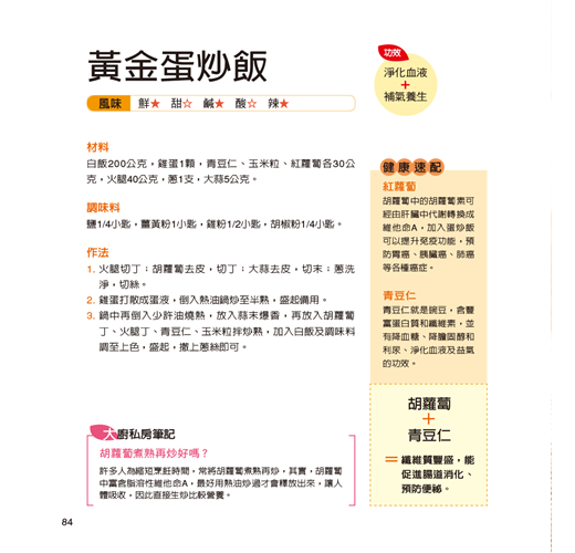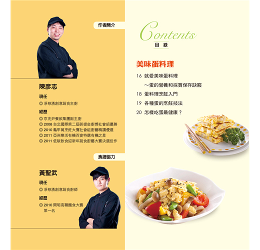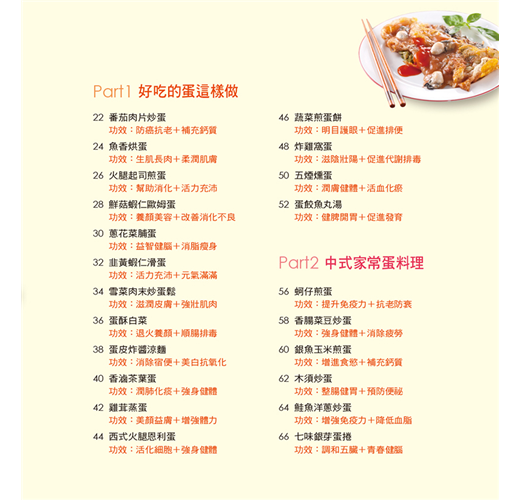 ●雞蛋營養價值高不僅是家中必備食材,更是滋補養生的好食材,書內以圖文並茂方式解說煎蛋、炒蛋、烘蛋、滑蛋、蒸蛋和炸蛋等六大烹飪技法,包括中式家常風味、異國風味,以及皮蛋、鹹蛋等變化式料理,內容豐富多樣,讓您吃得美味又健康!
