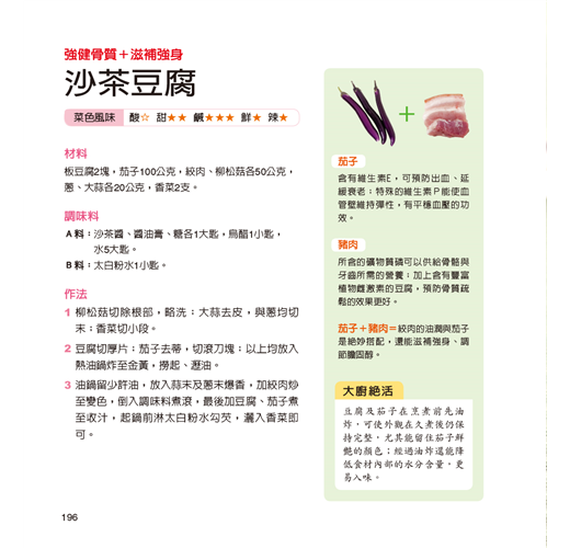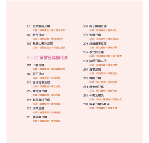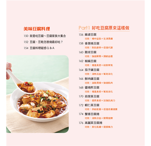 ●豆腐口感軟嫩清淡,無論涼拌、煎炒或燒滷,都能吃出美味,以常見的豆腐食材,包括板豆腐、嫩豆腐、雞蛋豆腐、凍豆腐、百頁豆腐、干絲、豆乾、臭豆腐、油豆腐等十餘種豆類加工品,逐一介紹採買、處理和烹飪訣竅,教您自己在家輕鬆做好豆腐料理。