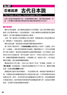 本書從100個主題為您剖析忍者的真實樣貌。藉由豐富且淺顯易懂的圖文表格,介紹忍者的歷史脈絡、技能、忍術、忍具等內容。讓大家能夠從中認識到同樣身為普通人類的忍者,如何付出心力去精進自己的心、體、技等層面,並且改變思維,重新感受忍者真正的魅力所在。