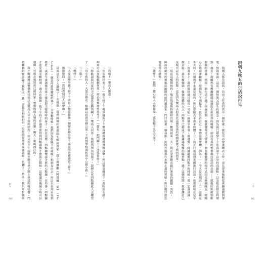 然後,我們回到家,回到日常的苦差事。雖然費竟盡全力,那個念頭仍舊在我腦中揮之不去,好似一本情節不賴的犯罪小說,被一條又一條的線索解開謎底。我們可以改變生活的方式──這個想法讓我心神不寧,取代原先那種毫無怨言的認份態度。我突然覺得「潔西卡‧佛萊契計畫」好遙遠。我不確定自己是否能保持同樣的步調再過三十年。我也突然發現,大半輩子都在期待退休生活(即使是很棒的退休生活),簡直就像中古時期的人才會做的事。我又不是農奴,日日辛勤耕作,最後因過勞方才結束勞碌的生活。我可是在二十一世紀的倫敦工作,生活應該要過得不錯、快活,甚至簡單。所以,三十三歲就在夢想退休人生的我,顯然有什麼地方必須改變。