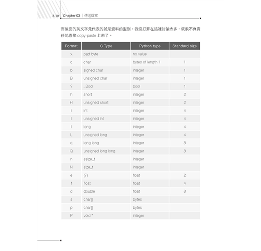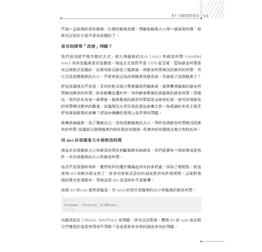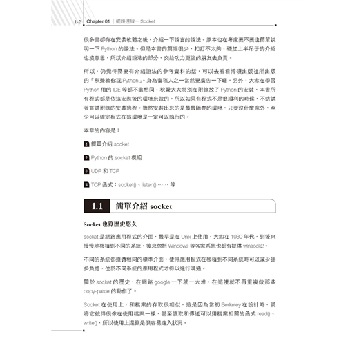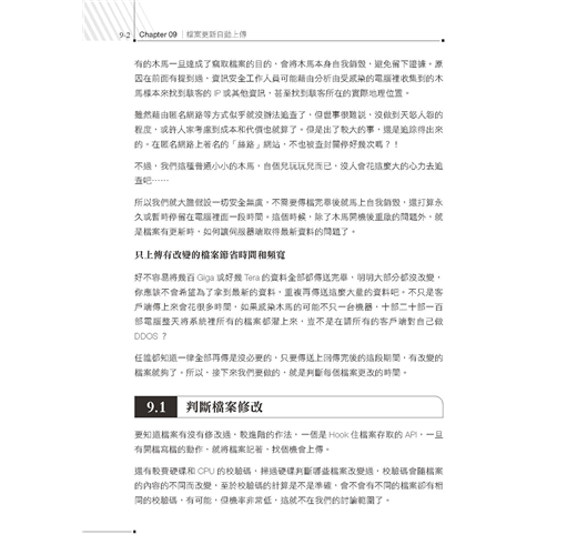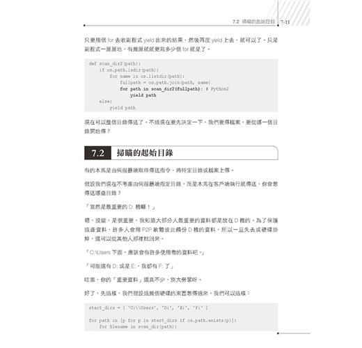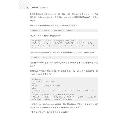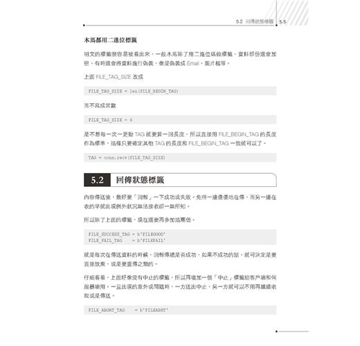 除了傳遞檔案、鍵盤記錄功能外,本書最為特別的地方在於靈活運用Python語法的巧思,例如:運用類別即物件的特性,依類別改變程式流程;巧用dict讓Python具有類似C語言的switch。另外,駭客製作木馬時,為了躲避除錯器的追踪,發展出運用exception來改變程式的走向的技巧。本書將這種運用exception的手法以Python實作出來呈現給大家,讓大家對於駭客的思路和程式設計的技巧有更多的認識。