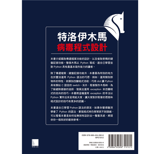 本書介紹竊取傳遞檔案功能的設計,以及偷取密碼的鍵盤記錄功能。整個木馬以Python寫成,適合已學習並對Python具有最基本寫作能力的讀者。