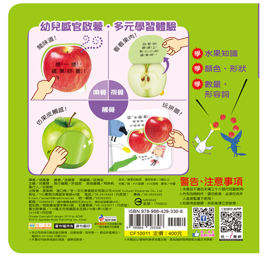2.觸覺:含仿果皮觸感、拼圖、翻翻頁等操作小機關,加深水果印象