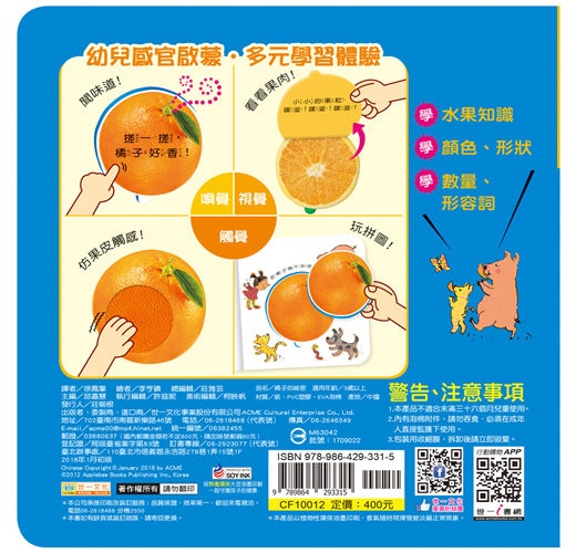 2.觸覺:含仿果皮觸感、拼圖、翻翻頁等操作小機關,加深水果印象
