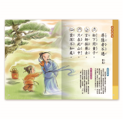 本書特別選輯了十二首易懂、易上口的唐詩,搭配精美插畫與淺顯易懂的白話文講解,讓孩子可以更加理解唐詩的內容涵意,體會古典詩詞的優美意境。