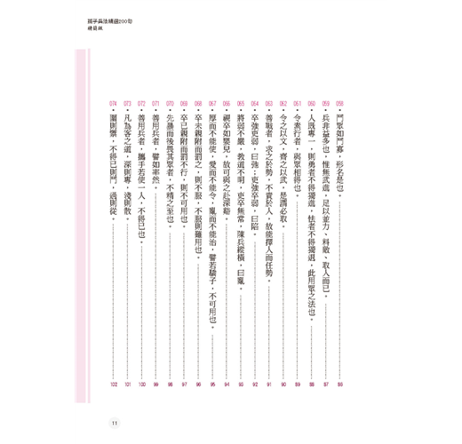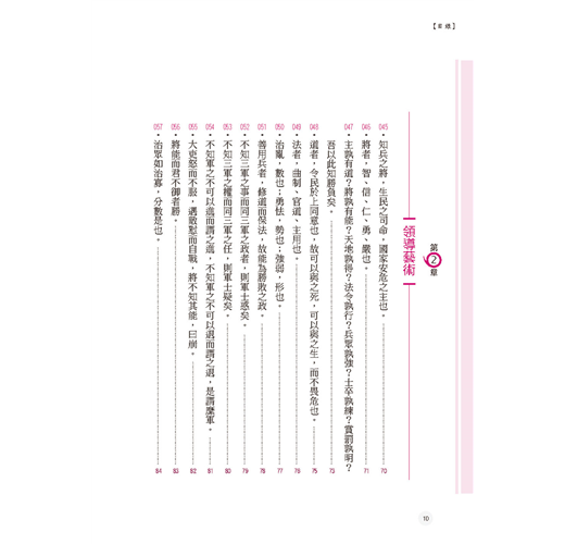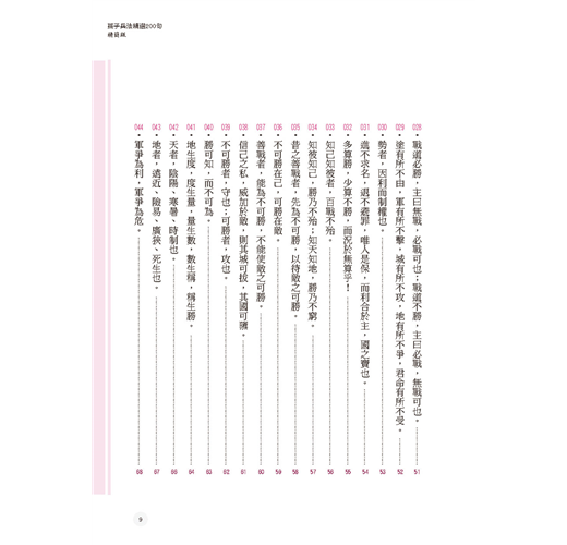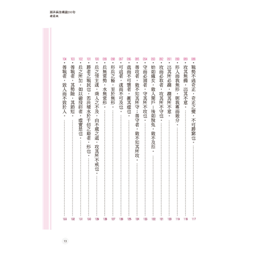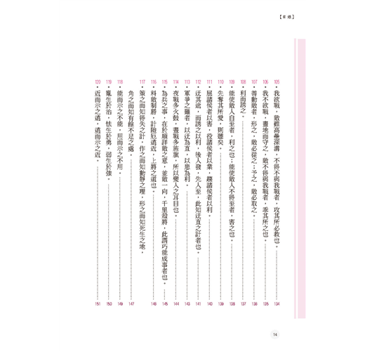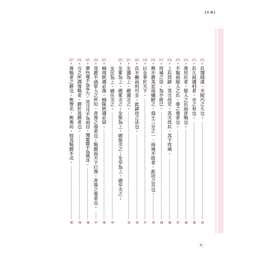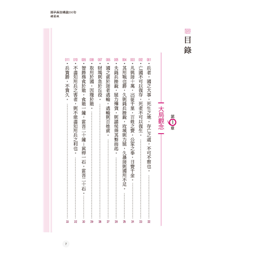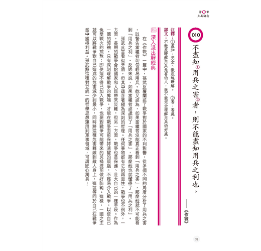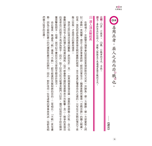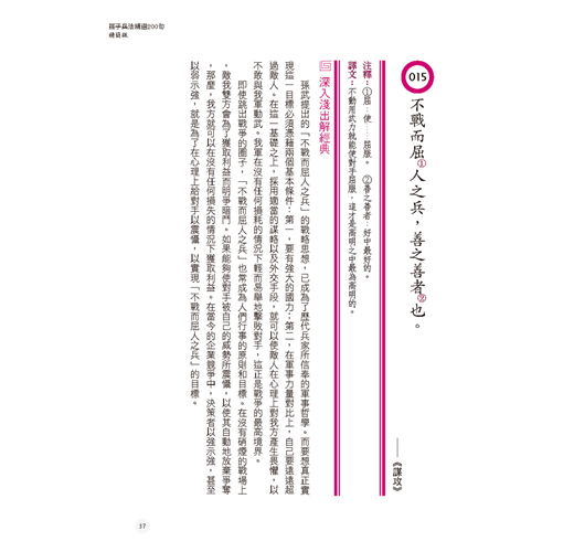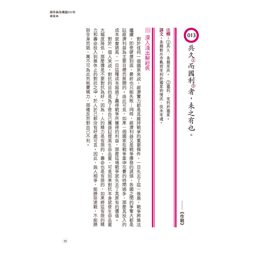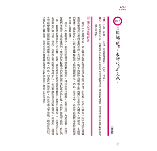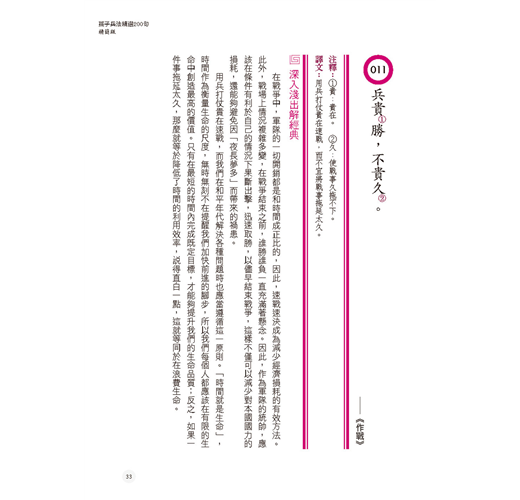 本書重視原文,更注重應用,深入淺出解析經典,用「知己知彼,百戰不殆」「不戰而屈人之兵」「兵者,詭道也」等古為今用的思想理念,讓讀者在風雲變幻中理解兵法的深奧含義,以至於在面對時事局勢時,能處於更高的視角通盤檢視以擬定致勝策略。用精確、合理的解讀與注釋,讓讀者領略更真實、更原汁原味的醇釀,形成自己的智慧解讀,並在實際應用中能夠悟興衰、明進退、知禍福。
