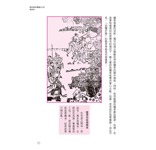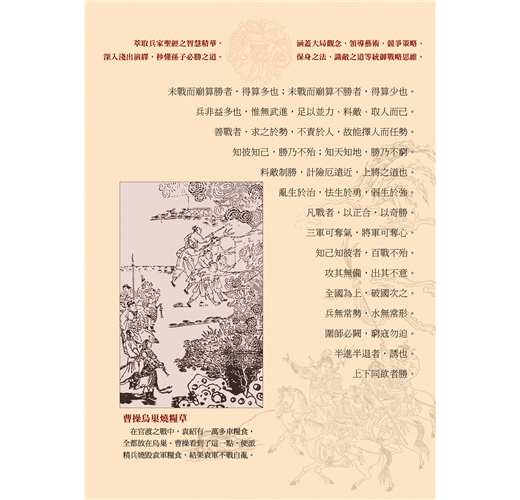 為了協助讀者順利理解先賢的智慧,本書特選經典古版畫為插圖。選圖時,嚴格依循插圖清晰、文字插圖對應等原則,使每一幅插圖都成為文中解釋經典不可或缺的部分。文圖對照、以圖釋文,生動鮮明,力圖使閱讀變成一件賞心悅目的事情。編者提供相關古文字詞的注釋,為讀者掃除閱讀上的障,使玄之又玄的戰爭思想成為通俗易懂、可以隨手拈來的智慧錦囊。文字有限,內蘊無窮,期待能讓讀者有所收獲。