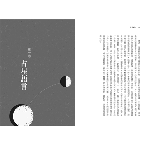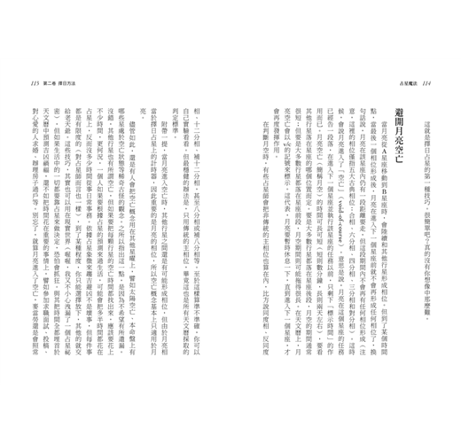 我寫這本書,就是為了消弭這兩者間的鴻溝。本來,我想將本書書名定為《為非專業占星的魔法師所寫的卜卦與擇日占星學》,但這樣肯定賣不出去,因為聽到書名,一般人不是覺得莫測高深(啥!卜卦?擇日?),要不覺得無聊透頂(聽起來像是碩士論文或阿萊斯特.克勞利某個不成材的弟子寫出來的)。可是,請容我誠實告訴你,本書要談的的確就是這些,希望你不要太驚訝。還有,既然你都已讀到這裡,希望你已經買入手,要不然我會慫恿你忘掉上一段所講的,買書就對了。本書書名聽起來雖然平淡無奇,但絕對比你想像中更有用也更好玩。我說真的,我保證!