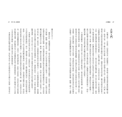 其實,我從來沒想過要寫占星書,更別說跟魔法有關的占星書了。但既然要寫,就一定要找個還沒有被人炒作到爛或相對新穎的主題才行,當然,要是能找到從沒有人寫過的題材,那就更棒了。不過,這個想法聽起來太天馬行空,甚至有點目中無人。唉呀!可別忘了女神的殷殷告誡:切忌傲慢。但話說回來,我只是在做自己想做的事情,而且要不是因為讀了巴克蘭那本藍色的大作《巫術完整指南》對占星學的介紹,我可能根本不會走入占星領域。老實說,他的書我相當喜歡,而且讀得津津有味。可是,有一天,在讀了整整五頁占星的內容後,我忽然火大了起來,把書往牆上一摔,那本書彈到房間另一頭的地板上(當然不是書本自動在房間裡飛來飛去,我的法力還沒那麼高強)。之所以火大,是因為我不滿意巴克蘭對占星學的介紹;書中,他除了建議學生學會自己排盤、解盤,並根據行運和推運來預測事件外,對於如何將占星運用在法術上,居然隻字未提!我下功夫鑽研後發現,讀到的每本占星書作者或每個和我談過相關話題的人都告訴我:「對,占星學對魔法而言很重要,所以把它搞熟就對了。」但沒有人告訴我,然後呢,該如何運用?後來我才發現,占星術除了用來解讀一個人的性格外(這點相信大家都非常清楚),在日常生活中還有許多用途,絕對不只是解讀命盤而已。