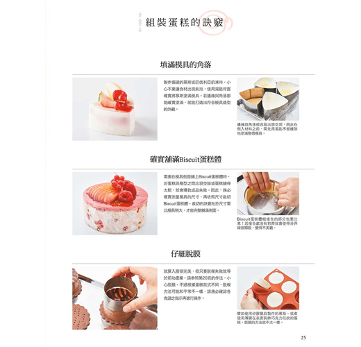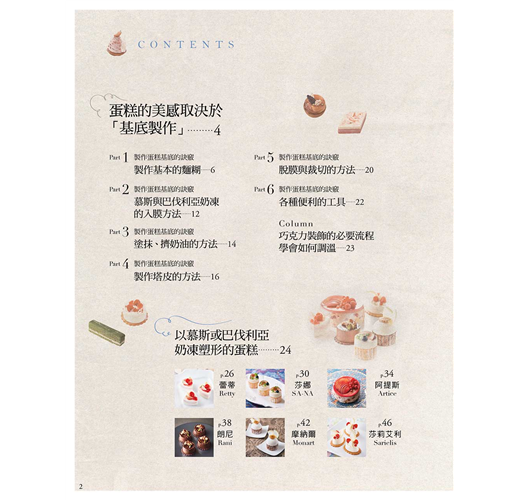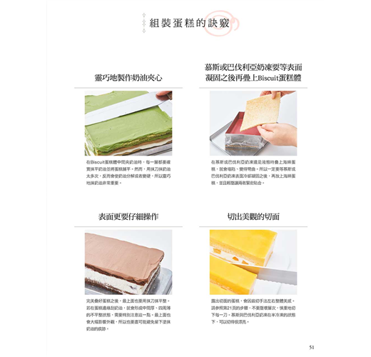 將麵糊抹平在烤盤上烘焙、平整地組合奶油與慕斯、做出銳角讓蛋糕成形等,每一個重點都是很平淡的操作,或許會令人覺得:「到現在還在說這些?」然而,正因為這些細微而平淡的工序綿密堆疊,才能向美麗的蛋糕跨出一大步!