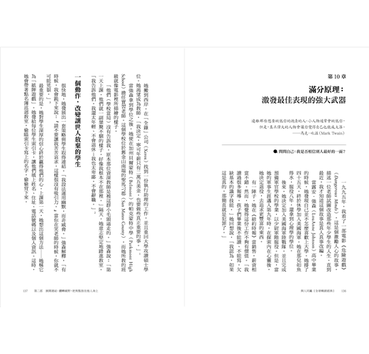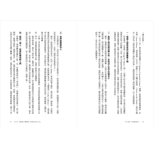 第二,它是合乎邏輯編排的。麥斯威爾博士有系統、有條理地組織章節分割,讓讀者更容易在思路上跟隨他的思考邏輯。全書將人際關係的二十五個原理分成五大部分:認識自己、連結他人、建立信任、投資他人、互惠雙贏。