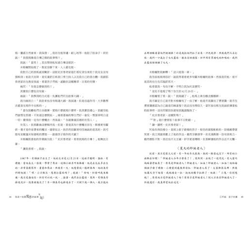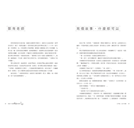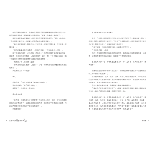 「當你鼓勵他們自由發揮、愛寫什麼就寫什麼時,我其實很擔心。我確信他們會愣在那裡,不知道怎麼開始。」她看著她的學生們好一會兒,想要弄明白這一切,覺得我一定有什麼魔法,然後說:「你就像童話裡的吹笛人。」