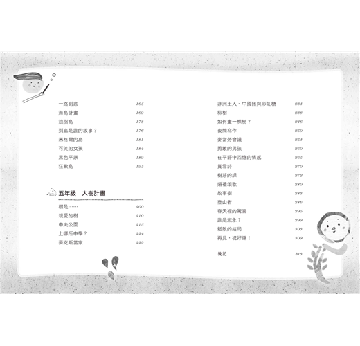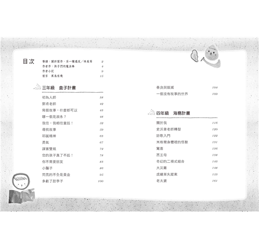他帶孩子們到博物館看盒子展,再讓他們製作盒子,創作一本訴說盒子故事的「盒中書」;請孩子們把身體的輪廓畫成一座小島,寫出自己的小島故事;帶孩子們到中央公園各自認養一棵樹,觀察樹的變化並寫信給它,最後編輯出版成《樹之書》……