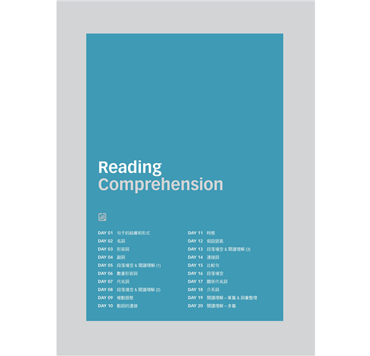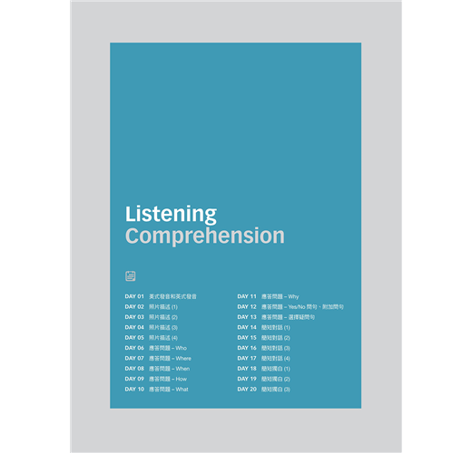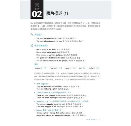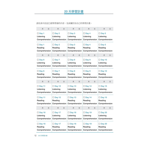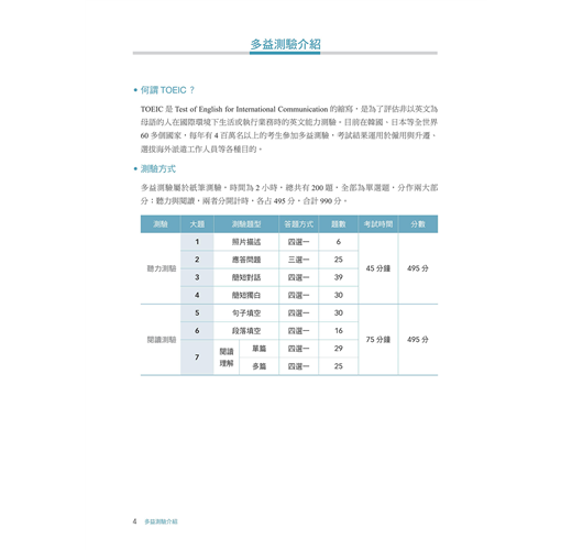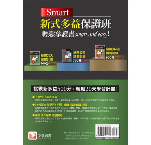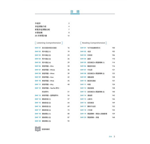 1. 了解2018新式多益:將聽力與閱讀的題型、主題、文法、常用字彙語句規劃成20天課程,深入淺出的說明讓您輕鬆理解新式多益。