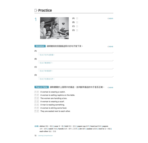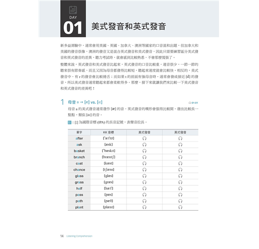 2. 學習→練習→驗收:認識新制題型後,聽力篇提供Dictation(聽寫)練習,閱讀篇學習重要文法,雙管齊下有效提升聽讀能力,最後以模擬試題檢驗學習成效。