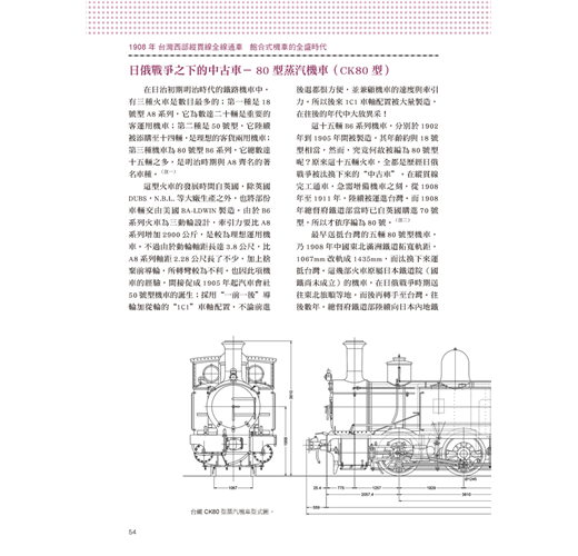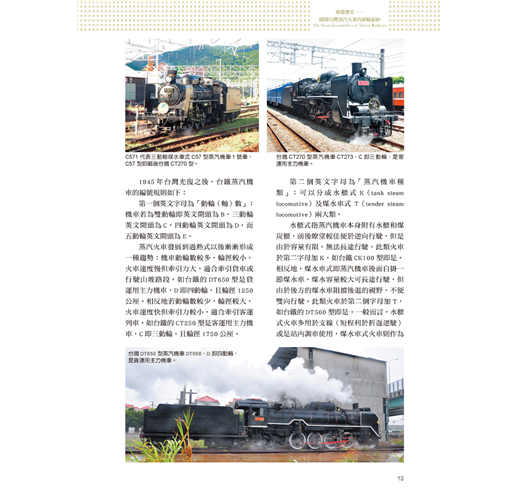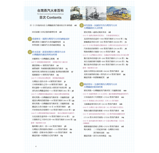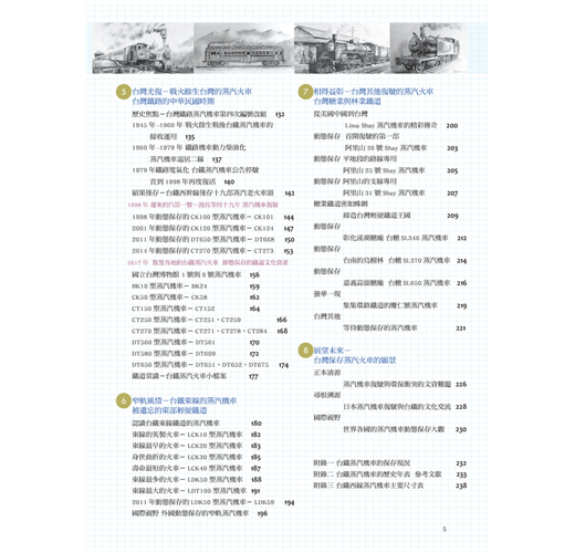 全書共集結有500多張海內外蒸汽火車的相片,50多張作者手繪蒸汽火車的畫作,並30多張蒸汽火車AutoCAD數位繪圖。依歷史軸承,依續帶出台灣鐵道蒸汽火車史的演進。更整理從2001-2017年台灣復駛的蒸汽火車現況,以及未來蒸汽火車保存的願景展望。期許這項重要的文化資產,能在更多人關注與珍惜的情況下,為台灣的豐富更增新頁。