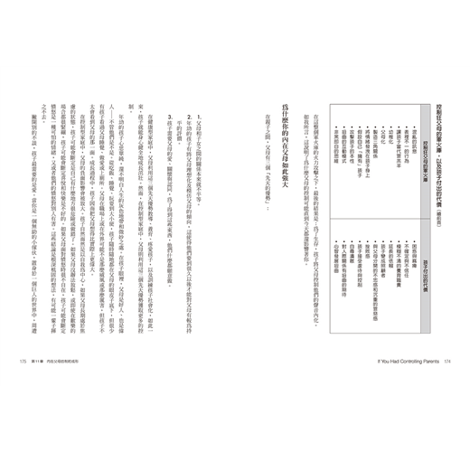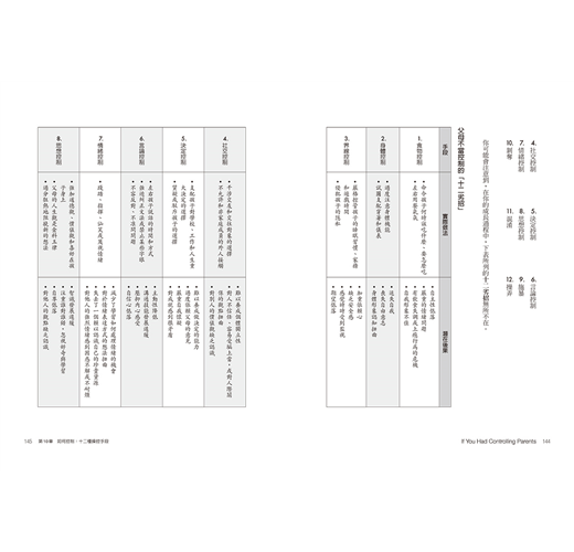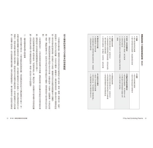 「說明過度控制的父母如何否決反對意見、壓抑強烈的情緒、批評而不讚美、訂下嚴苛的紀律、逼迫孩子必須努力爭取他們的愛,以及堅持他們永遠是對的。」