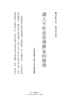 本書我用第一線服務人員的角度,觀察身邊的所有好服務、壞服務。我認為好的服務並非只是一味迎合客人、百般討好、千依百順,而是在客人合理的要求範圍內,用不矯情的方式,給予貼心而專業服務。