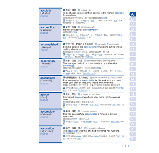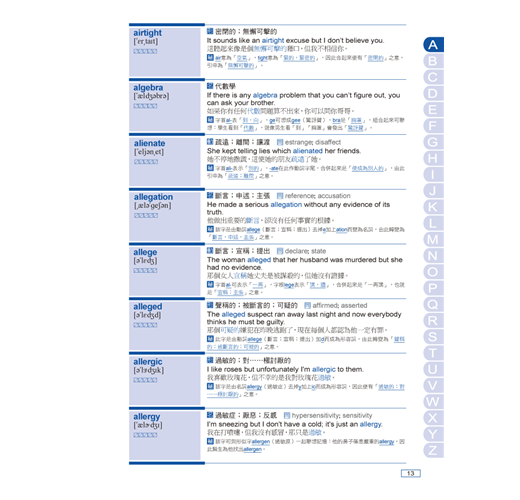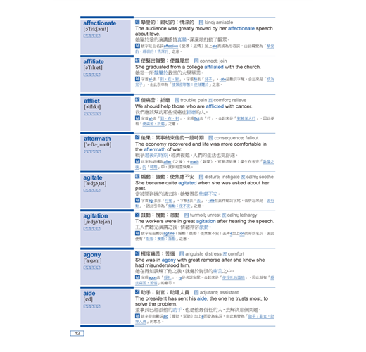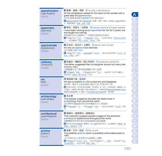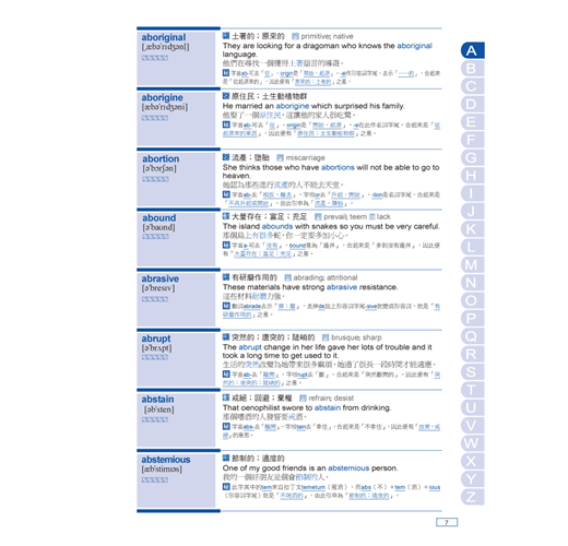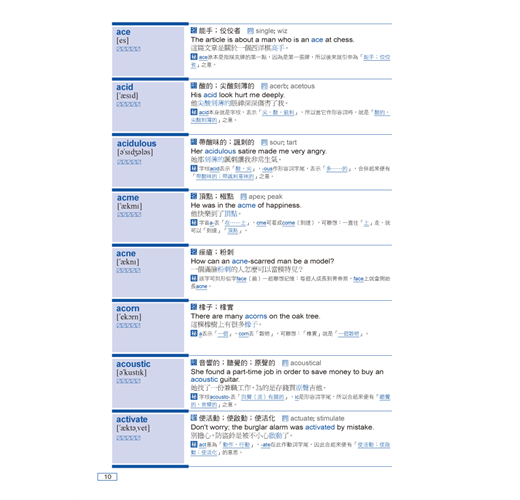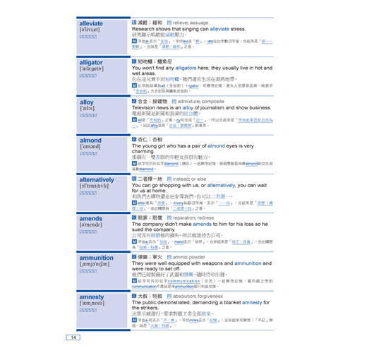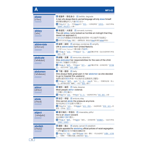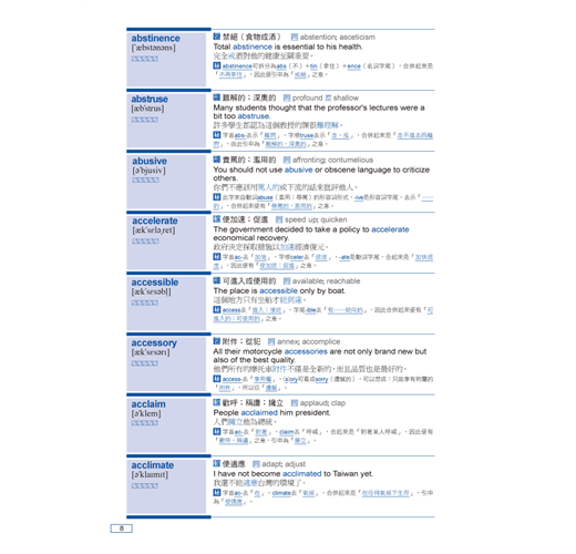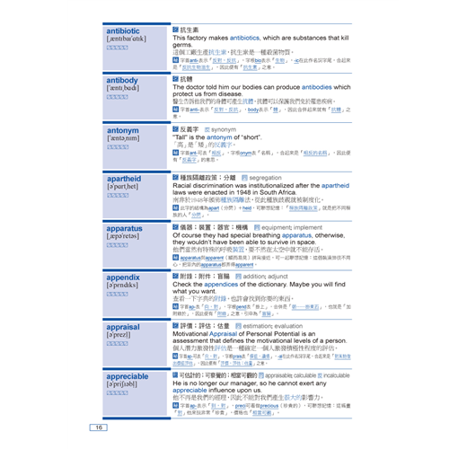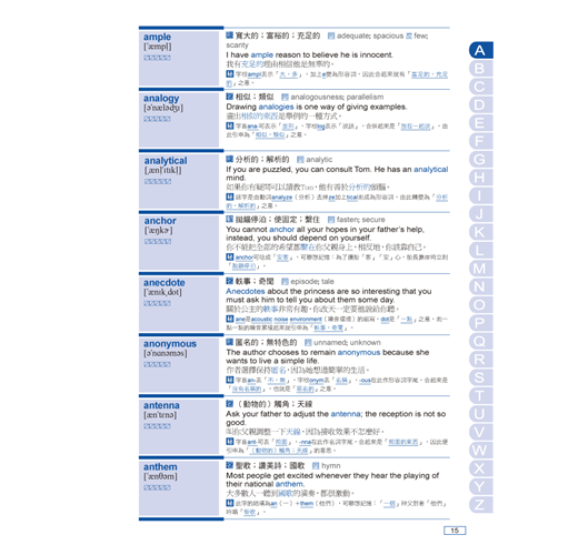 此書精心設計的排版方式,讓讀者先不要看中文解釋,試著以英文同、反義字猜出單字意義。若用同、反義字無法理解字義,再於例句中前後推敲單字。如此就可在短時間內大幅增進字彙理解能力。