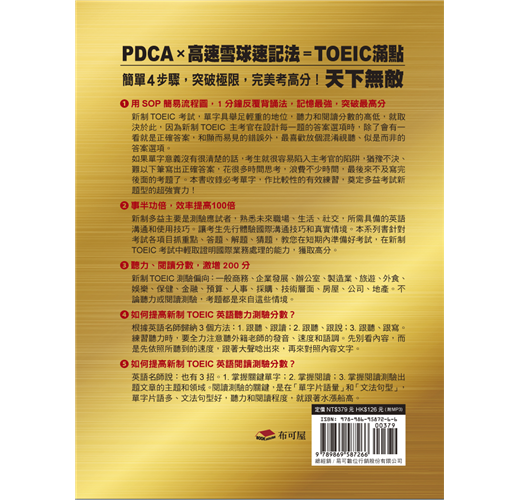 本書電腦嚴選新制多益測驗中,出現頻率最高的單字,教您如何在短期內準備好考試。為了有效率地提新制多益應試者的英語單字理解力、運用力以及英語的綜合能力編輯而成。全部的字彙都附有例句一起學習,有很高的加分效果。