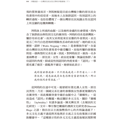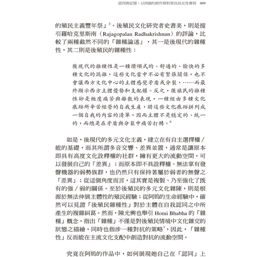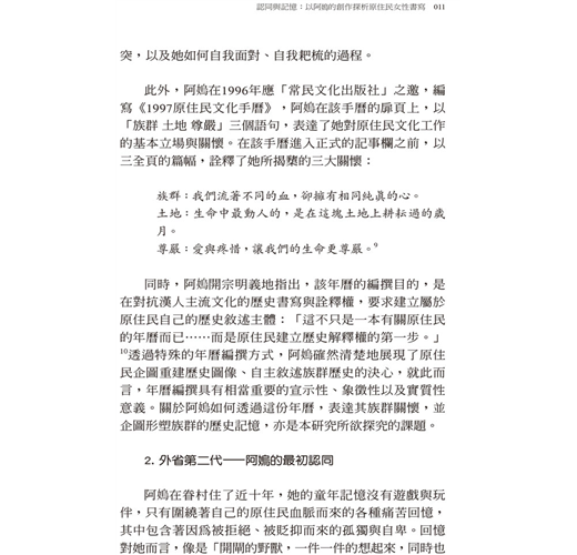 而附錄則是《後原運‧性別‧族裔—當代臺灣原住民族女性運動者群像》一書的〈導論〉。該書是由筆者與徐國明、李淑君兩位優秀的年輕世代研究者共同合作,以實地訪查的田野紀錄寫作而成;關於本書的內容與寫作動機,徐國明指出: