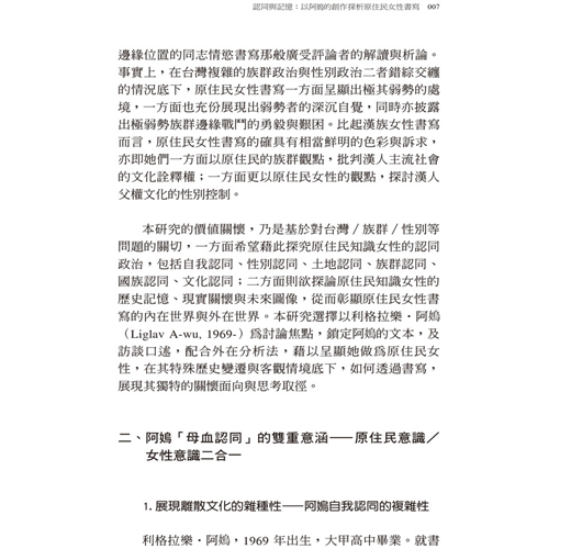 原住民女性作者做為多重「少數」,「我是誰」是她們必須不斷被質問、自我提問,以及面對的生命課題,「認同」也就成為她們書寫中的核心母題。麗依京、阿烏、阿綺骨三位作者,分別出生於1950、1969、1983,分屬三個不同世代,隸屬泰雅、排灣、阿美等三個不同族裔,分別從三種不同的角度,來處理自我身分認同的課題。阿烏著力於族群與性別的認同辯證,麗依京將族群認同與國族認同綰結在一起,而阿綺骨則游離出族群的疆界,思索主體內在的自我認同。三位作者筆下的主體認同差異紋理,使原住民女性書寫中的認同圖景更見多元紛繁。