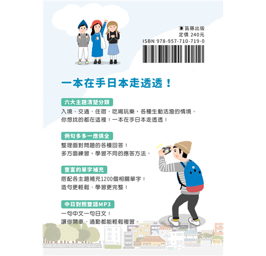在旅遊中學著開口說日語吧!不管是問路、點餐、買票都是很好的練習機會,本書透過簡單的分類、活潑的情境對話、簡潔的排版,讓你可以輕鬆找到自己需要的句子,旅遊也變得既輕鬆又有趣!除此之外更補充了多達1200個以上的相關單字,可以自由的替換句子來延伸使用,讓學習更豐富!