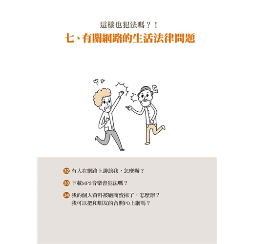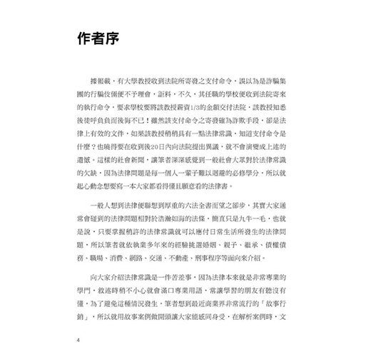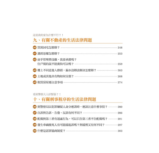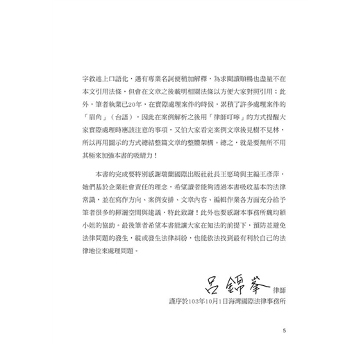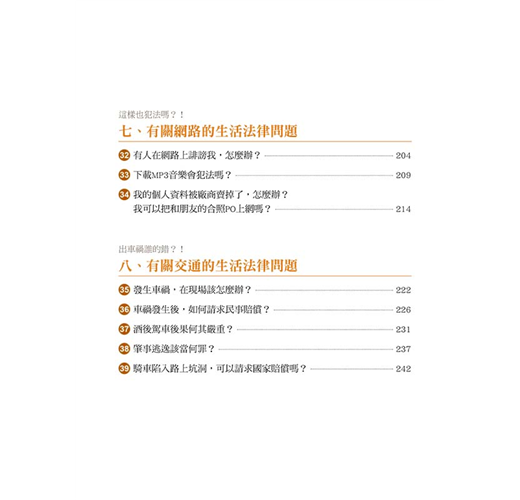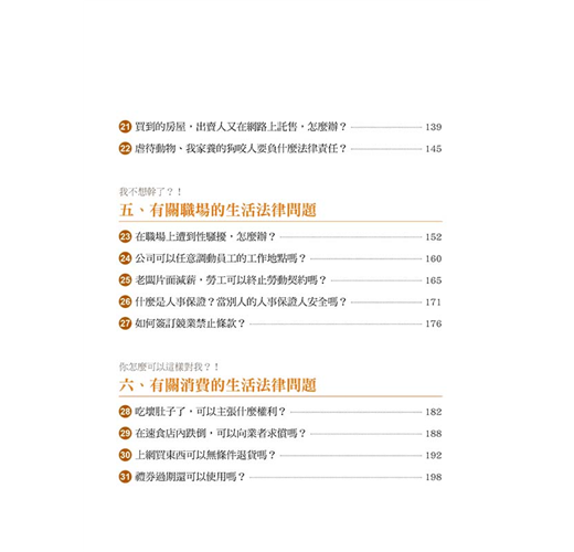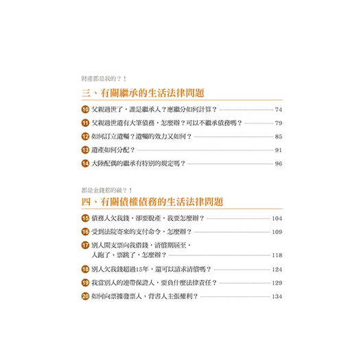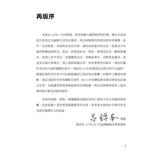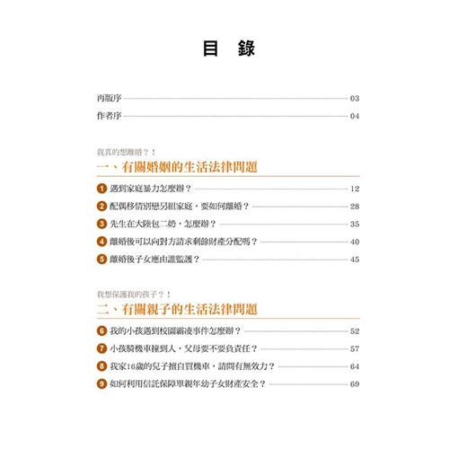 本書為了貼近讀者的日常生活方便閱讀,不以法條說明的方式講解法律問題,而是用實際的案件舉例、口語化的方式說明,讓您可以輕鬆閱讀!