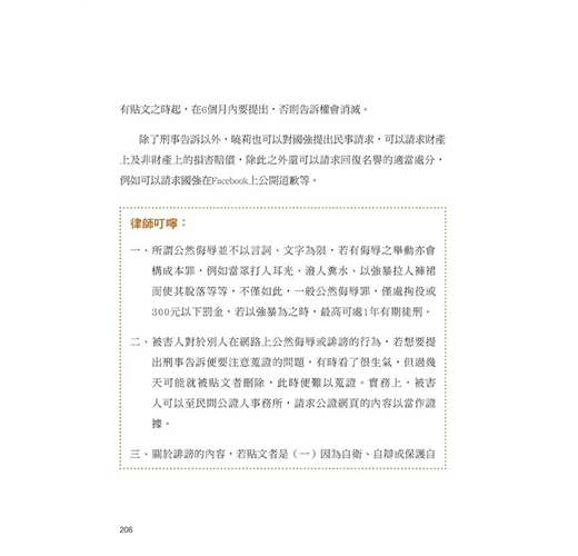 一般法律書大多限於法律問題的解答,但如何依法律程序處理以及實際處理時應該注意的「撇步」(台語)卻常常沒有提到。本書除了告訴您案例的解答外,還將處理時應該注意的「眉角」(台語)以「律師叮嚀」的方式提醒,讓您能更順利面對法律問題!