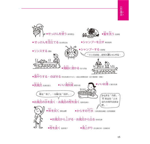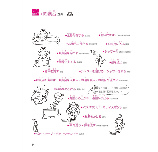 看不慣密密麻麻的單字書,你需要換一個方式學習!透過文字和影像的結合,讓接受的資訊透過圖像記在腦中,不用背就自然記住!洗澡你只會「お風呂に入る」嗎?本書還教你怎麼說搓背、淋浴、沖水、洗身體、洗頭髮,讓你真正學會日常生活中要用到的詞!