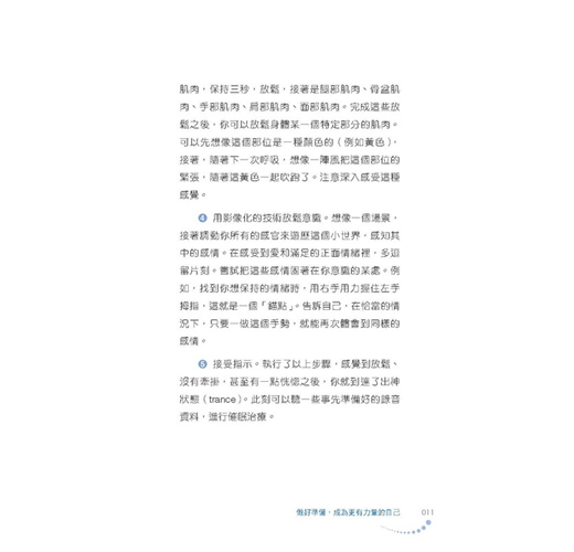 通過本書附贈的引導CD,放鬆,找到出神狀態後,播放以下錄音。錄音腳本如下:
