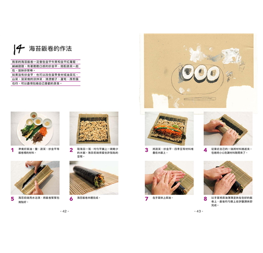 不同於日本的海苔壽司用的是醋飯,韓國的海苔飯卷是以芝麻油和鹽調味的白飯,裡頭包捲涼拌山菜或蔬菜、泡菜、醃蘿蔔、厚煎蛋、生菜等餡料。觀察韓國街上的海苔飯卷,從路邊攤只包著醃蘿蔔和芝麻的單純海苔飯卷,到包著堅果、海鮮、味噌絞肉等各種豐富的創新口味,可說應有盡有。