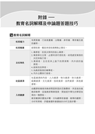 書中並附錄申論題答題的技巧,參加校長主任甄試應有的準備功夫,對於容易搞混的教育專有名詞,特地挑出來並整理說明,以方便讀者複習與自我練習。