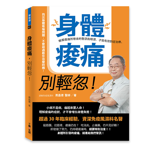 有感於此,本人在過去 15 年,針對風濕免疫病,陸續出版許多民眾衛教教書,包括《關節病與腰背痛》、《修格林症》、《疏腰鬆背事典》(已在大陸出版),《痛風的真相》等書。許多風濕病如:類風濕性關節炎、僵直性脊椎炎、乾癬性關節炎等相關疾病;從2000 年開始, 除了傳統消炎鎮痛劑外,尚有各種不同免疫調節劑,尤其是生物製劑,已可有效地控制過去難以治療之關節炎疾病。
