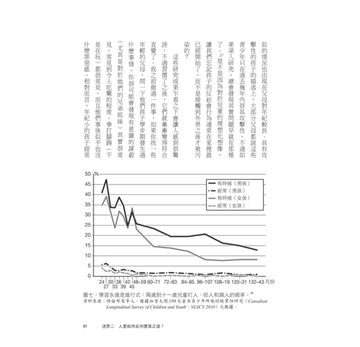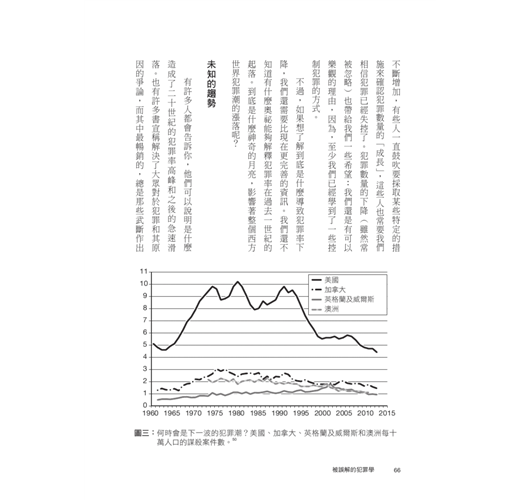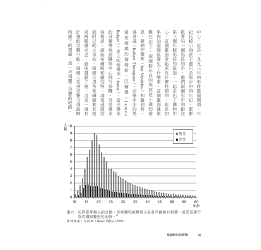 在過去十年,北歐五國、紐澳與英美國家的犯罪率(特別是殺人犯罪)都呈現下滑趨勢,其實臺灣也是如此。在反駁迷思二有關犯罪者的生活方面,作者在內文中帶出年齡犯罪曲線(age-crime curve)以及相關的故事案例告訴大眾,犯罪似乎是年輕人的專利,但過了二十歲後,其實犯罪數量是減少的,並非如外界預期作案數會不斷增加。