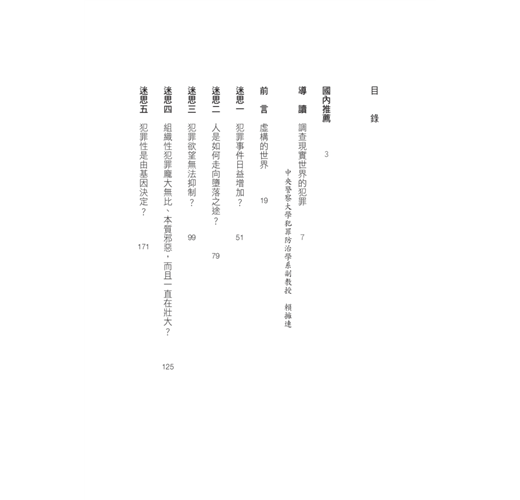 本書運用實際數據破除有關犯罪學方面的十一個迷思,舉凡犯罪日益增加、犯罪組織龐大邪惡、加強警力的必要性、嚴刑峻法的有效性、激進的改革方案等,這些迷思不僅困擾了英美等先進國家,我國也無法倖免。這些迷思讓我們浪費了許多資源,而且效果不彰。