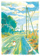 河野史代認為僅有災區風景,會顯得太過單薄,必須加上「人間物語」來傳達生命的樣態,而這個責任就由一隻帶著點自戀、有著天兵喜感的公雞來擔當。在她的塑造下,公雞先生雖然失去了妻子,卻不帶任何的「悲愴」感;就算人們對災難的記憶已逐漸淡薄,他還是持續著自己的旅行。在他心裡,妻子美麗又強悍;不過他從不說肉麻話,只有調侃。例如二○一一年十二月,公雞先生來到陸前高田,畫面幾乎是一片黃土: