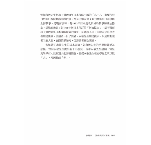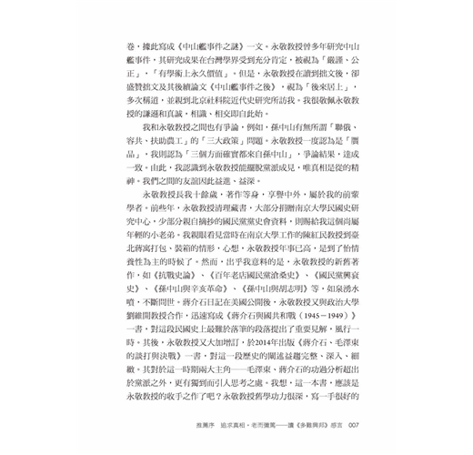 匆忙讀了永敬先生的這本書稿,對永敬先生的治學精神至為感佩。曾向永敬先生提出若干小意見,皆承永敬先生接納。嘗見史學界有人見到別人批評就惱怒,益覺永敬先生在史學界之所以能「大」,乃因其能「容」。