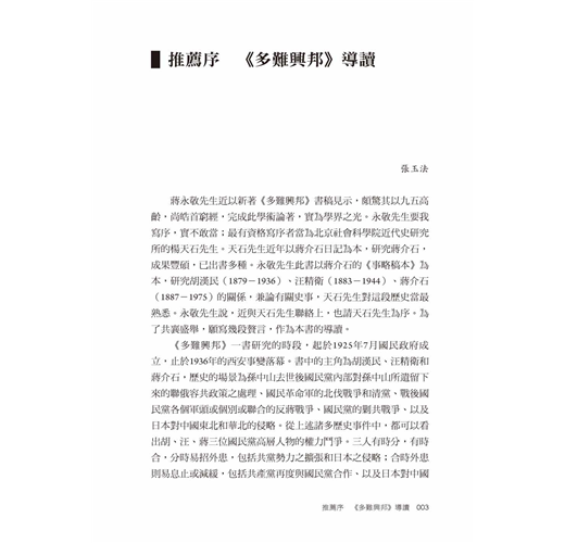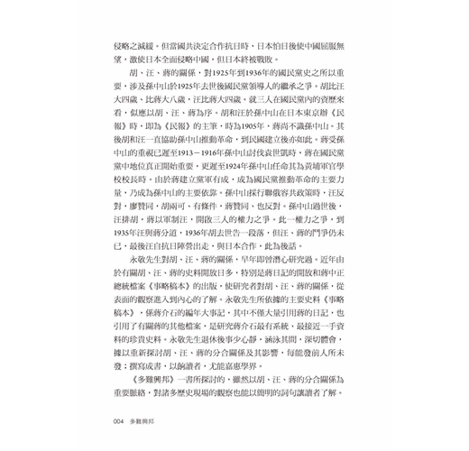《多難興邦》一書所探討的,雖然以胡、汪、蔣的分合關係為重要脈絡,對諸多歷史現場的觀察也能以簡明的詞句讓讀者了解。