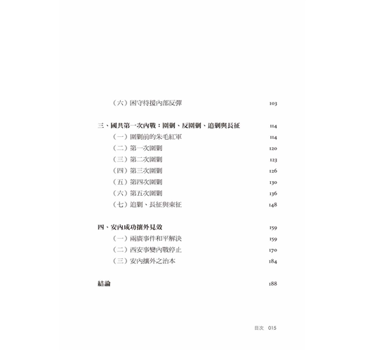 本著第三部分「國共第一次內戰:圍剿、反圍剿、追剿與長征」。國共在大陸時期,有兩次內戰,一為抗戰前從1930年到1936年的六年內戰;一為抗戰後從1946年到1949年的四年內戰。第二次國共內戰研究,著者近年有《蔣介石、毛澤東的談打與決戰》的問世。為填補此一缺口,茲就國共兩方資料,作一系列之探討。