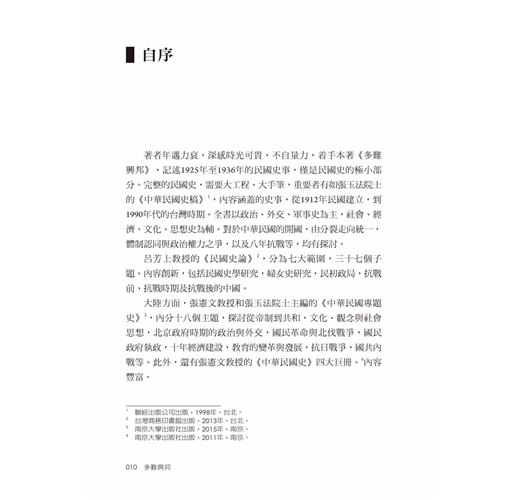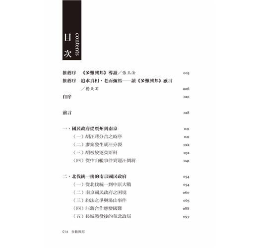 本著《多難興邦》,是記述國民政府從1925年7月在廣州成立後,到1936年12月西安事變國共內戰停止,其間十一年半的史實。在此期中,內憂外患,互為影響,循環激盪。即每當內憂嚴重時,外患亦隨之加劇。或當外患嚴重時,內憂亦隨之增強。例如1927年及1928年寧漢分裂及北伐戰爭,而有南京事件五國通牒及日本兩度出兵山東;1930年的中原大戰及寧粵分裂,而有中東路事件及「九一八」事變;而「九一八」事變,中共紅軍之勢力,因之膨脹;此亦促成國民黨人部分的團結。在此內憂頻仍、外患深入之際,蔣介石以「忍辱負重」之精神,克服難關,化險為夷,使中國分而復合、衰而復興,可謂「多難興邦」。這一史實,過去的研究,雖屢見不鮮,但由於新史料的出籠,特別是國史館蔣中正總統檔案《事略稿本》八十二冊千餘萬字的刊佈,其中一至四十一冊,正是這一時期的史料,在長篇累牘中,不乏精粹。著者以「沙裡淘金」的心情,希從這些大量資料中,尋找一些精粹,輔以必要的佐證,來對這一時期的史事,作一補充,提供同好者的品嘗。