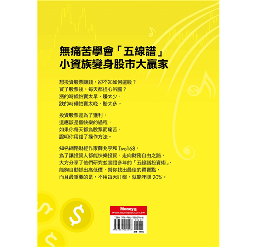 知名網路財經作家薛兆亨和Tivo168,為了讓投資人都能快樂投資,走向財務自由之路,大方分享了他們研發、實證多年的「五線譜投資術」,可以自動抓出高低價,判斷最佳的買賣點,而且最重要的是,不用每天盯盤,就能年賺20%。