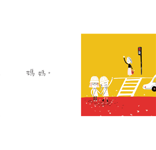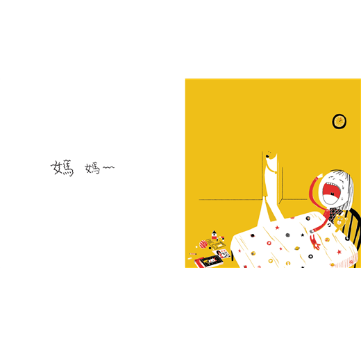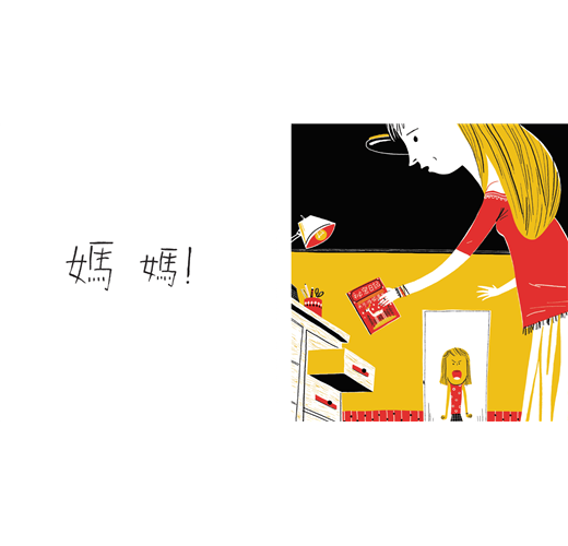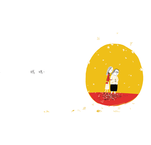 強烈的紅黃與適時鋪陳的黑色調,讓畫面營造強大的張力!雖沒有完整的文字敘述去呈現故事,但起承轉合藉由「媽媽」二字的字型變化與畫面的安排,讀起來有細細流動、逐漸翻滾襲來的情感在心中蔓延的感受,迫使讀者得正面回應那份渴求:想再見到媽媽、想當面感謝她、懷念她的一切和愛……