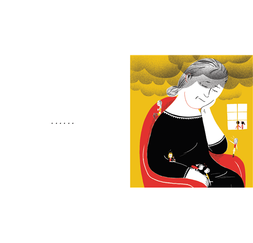 書中的文字,如有生動表情、豐沛力量,像是跳動的音符直達心坎裡;而每張畫串連起來就像是欣賞一部無聲電影,娓娓道出母女心緊緊相連的情感。其中,閉上雙眼沉思的媽媽,透過頭頂上的烏雲遍布,可知道她看的、念的都是女兒的幸福,而煩憂即是來自媽媽的關心、亦是無聲的愛。