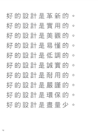 「更少,卻更好」是Dieter Rams 對自己作品的形容。他為德國知名家電品牌Braun 設計出許多經典的產品設計,成為20 世紀中期最重要的工業設計師之一。他的許多設計,諸如咖啡機、計算機、收音機、視聽設備、家電產品與辦公產品,都成為世界各地博物館的永久收藏。在他的作品上很容易發現包浩斯風格的痕跡:簡潔卻深刻,實用又好用。蘋果的首席設計官Jonathan Ive 便受到Rams 的設計影響,創造出許多膾炙人口的產品設計。 而他的十個好設計準則,又稱設計十誡,為「怎樣的設計才是好的設計?」這個難題提供一個值得參考的「答案」。