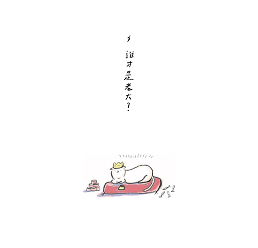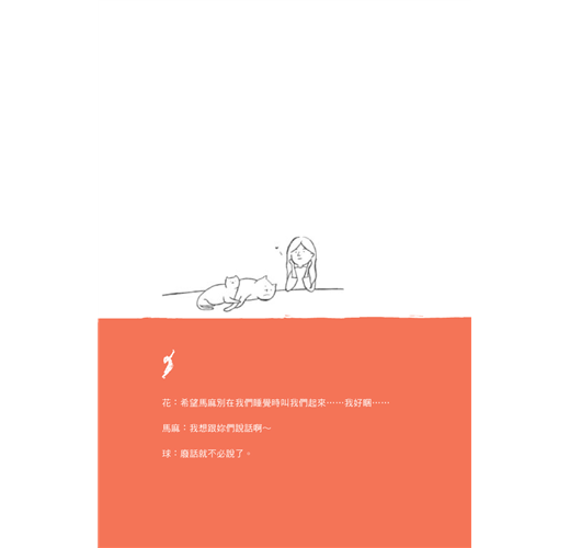 就像家家酒。明玉姊身為遊戲的主揪者,除自身角色,尚兼任旁白,操持互動節奏、情節推進。這些寫小說的她理應駕輕就熟,然而貓群處於「人語之外」,得以自旁白引導逸出,胡闖遊戲場域。於是,主述故事的,專情於插敘那些不按牌理出牌,直到敘事被球咪、小花、小三全面占領、家人亦一個個將自己的對白溫柔出讓,有貓的家家酒遂纏綿成一部因貓笑淚的家庭紀實。