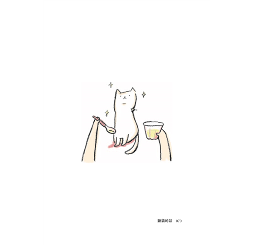 可是啊!我應該像明玉姊一樣,做一名聽貓說話的人呀!拋卻心碎之憂,大膽恣情地去愛,無畏旁人與貓事主的眼光,跟上每個呼嚕、喵嗚,自顧自譯貓語:「我喜歡這樣,我喜歡在你身邊,喜歡你。」也許貓咪專吃這套,愛貓人必得集自信與癡態於一身,想方設法,將貓的內外動靜,轉譯為呢喃愛語。一如十條〈與貓貓的約定〉羅列下來,偽數落實褒揚、假規範真討寵,狗型人如我,讀得又抖又笑。反主為奴、耽溺且甘願的心情,簡直是對空氣畫押,一呼一吸都掛保證。