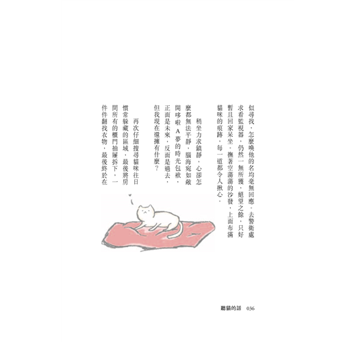 雖然一度也有「自己是貓吧!」這樣的念頭。但所謂的冷靜乖僻、淡漠霸傲,終究只是對貓、對自己的偏見或錯認。尤其,每和明玉姊相約,她那受牽制般,置身約會現場卻又心滯貓側,忍不住絮絮叨叨的貓事,就像周密對證,一一剔去我自賦的貓殼,還胎為狗,搖尾涎舌地羨聽人貓間種種黏賴與捉藏。