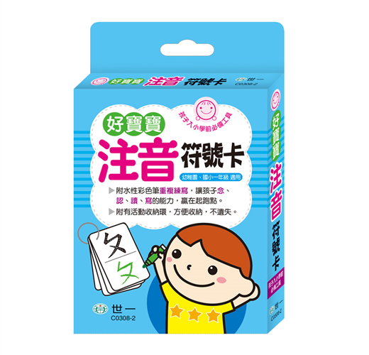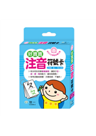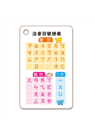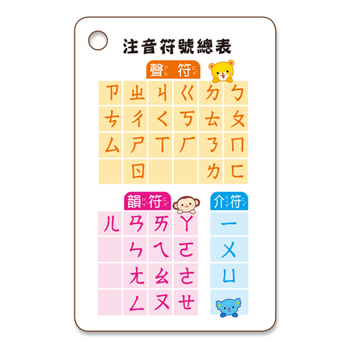 雙面上光裱褙的注音符號卡,可重複擦寫練習使用,所附之塑膠扣環不僅讓紙卡能方便收納,還能隨身攜帶,讓寶貝不管走到哪,皆能隨時隨地練習、認識37個注音符號。